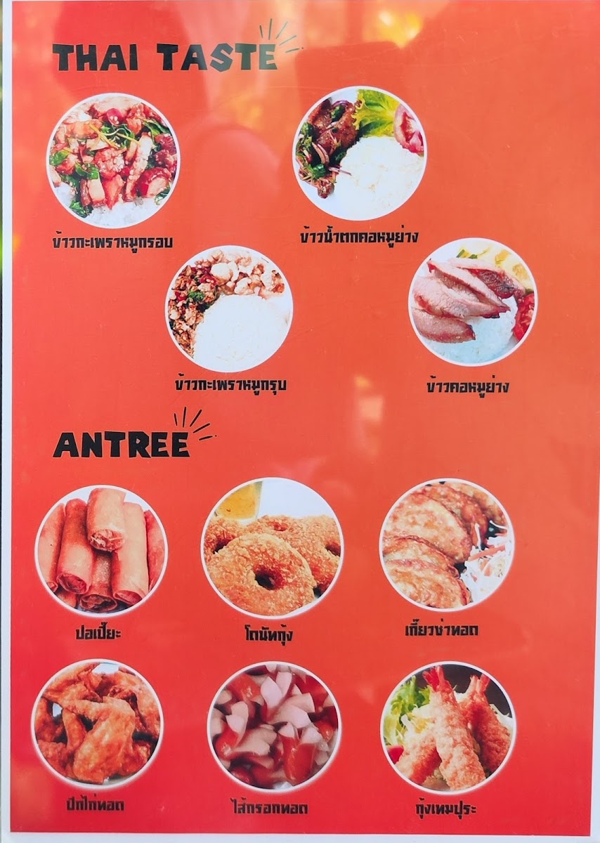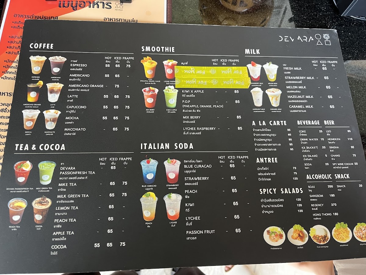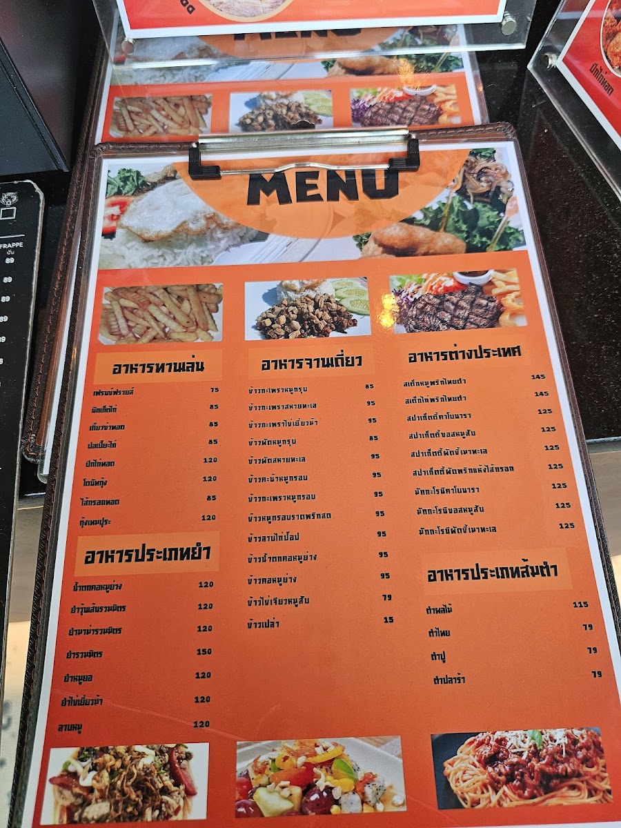 The menu offers a variety of beverages and food items suited for casual dining and light meals. Guests can find a selection of teas including Passionfresh Tea, lemon tea (ชามะนาว), and fresh milk green tea flavored with pineapple, orange, and peach. For those seeking savory options, the menu includes mixed glass noodle salad (ยําวุ้นเส้นรวมมิตร), instant noodle salad (ยํามาม่า), and fried snacks such as fan-fried chips (เฟนฟลายทอด) and French fries.