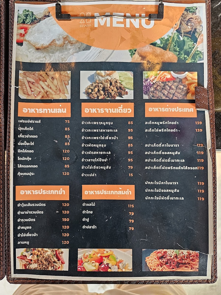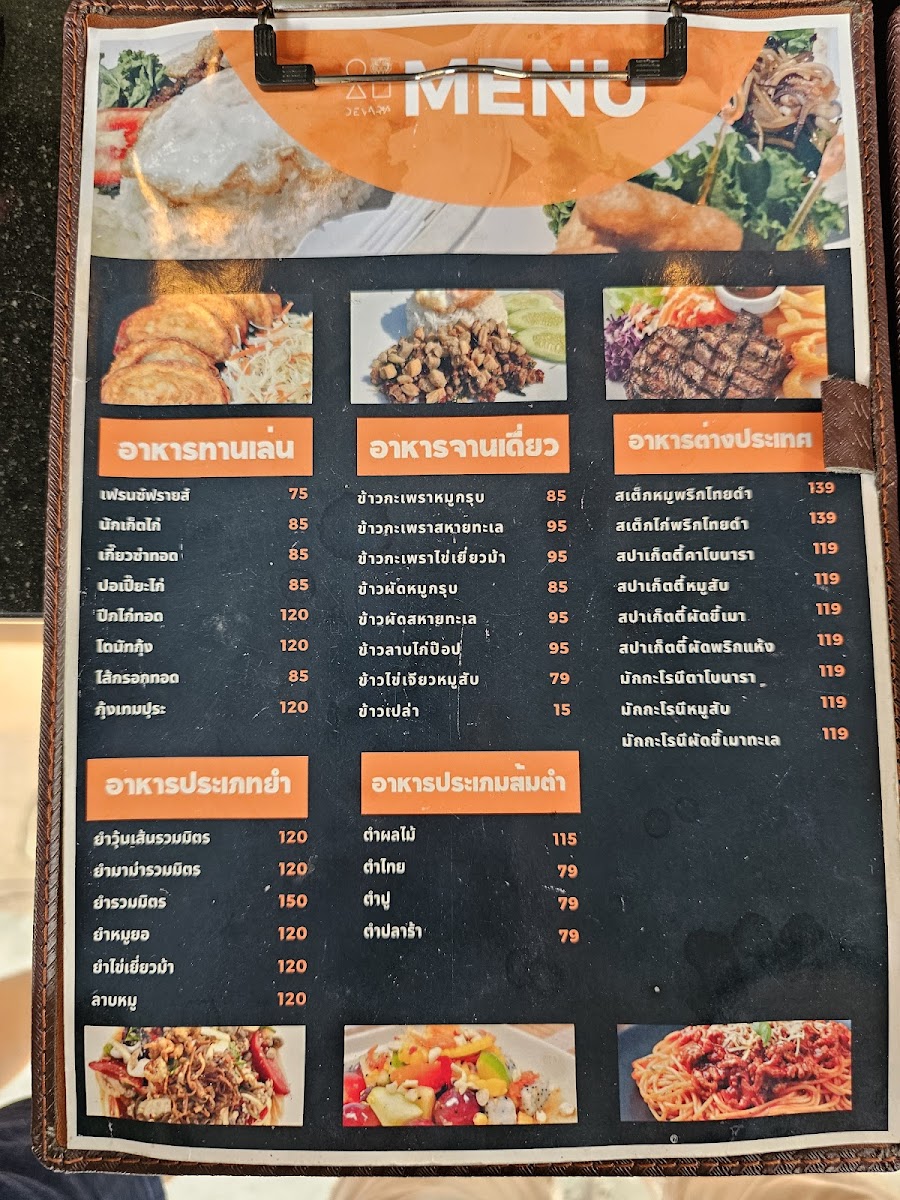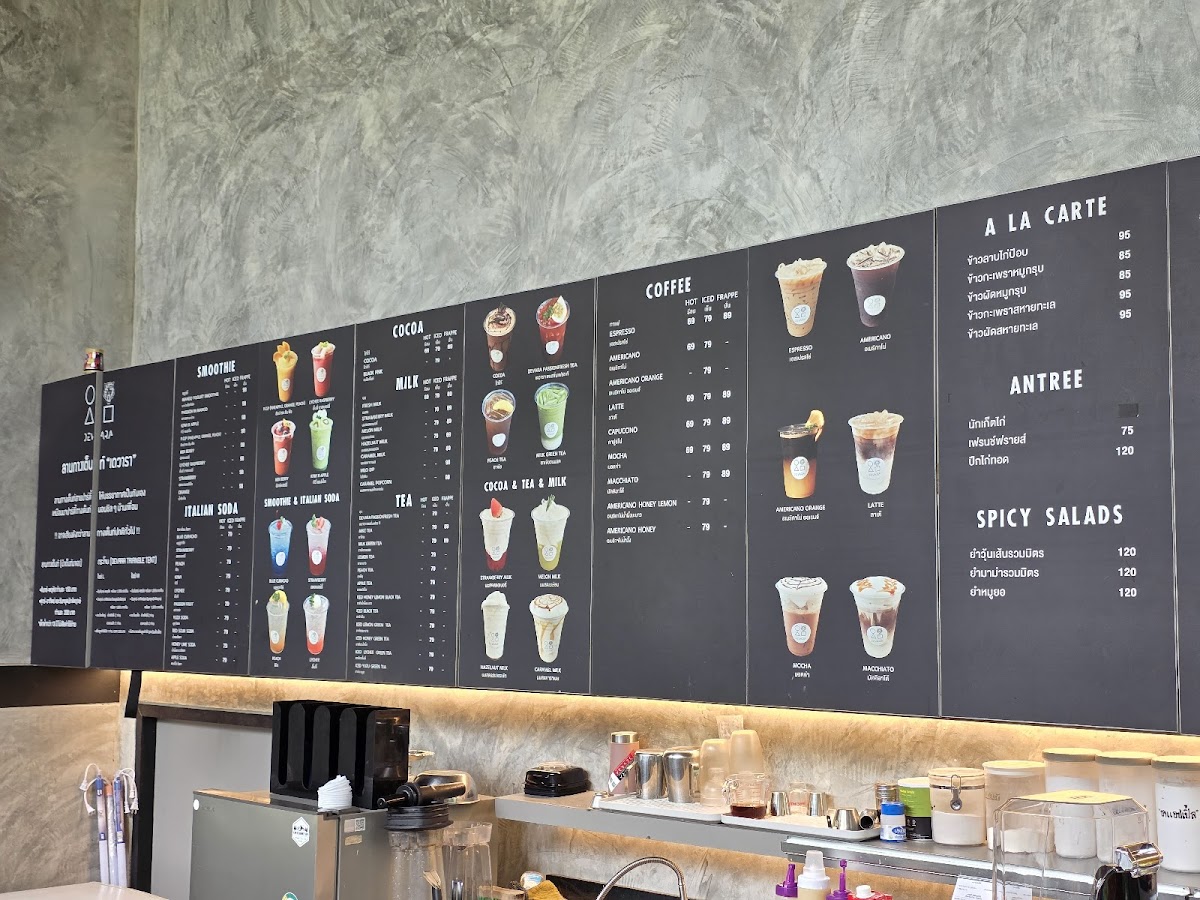 The menu offers a variety of beverages and food items suited for casual dining and light meals. Guests can find a selection of teas including Passionfresh Tea, lemon tea (ชามะนาว), and fresh milk green tea flavored with pineapple, orange, and peach. For those seeking savory options, the menu includes mixed glass noodle salad (ยําวุ้นเส้นรวมมิตร), instant noodle salad (ยํามาม่า), and fried snacks such as fan-fried chips (เฟนฟลายทอด) and French fries.
